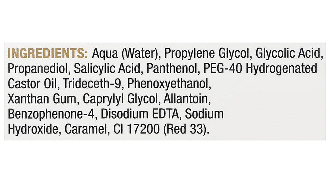 Aqua (Water), Propylene Glycol, Glycolic Acid, Propanediol, Salicylic Acid, Panthenol, PEG-40 Hydrogenated Castor Oil, Trideceth-9, Phenoxyethanol, Xanthan Gum, Caprylyl Glycol, Allantoin, Benzophenone-4, Disodium EDTA, Sodium Hydroxide, Caramel, CI 17200 (Red 33).