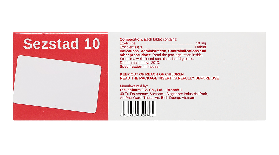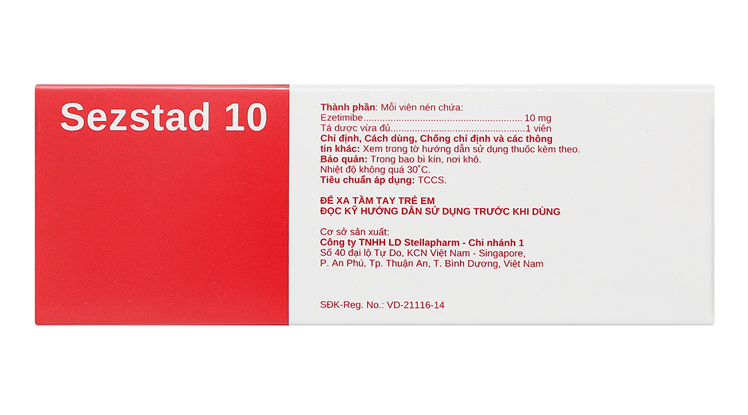 – Thận trọng khi sử dụngEnzym gan Tình trạng tăng transaminase liên tục (≥ 3 lần giới hạn trên của mức bình thường (ULN)) đã được nhận thấy ở những bệnh nhân sử dụng đồng thời ezetimibe với thuốc nhóm statin. Khi kết hợp ezetimibe với thuốc nhóm statin, cần đánh giá chức năng gan khi bắt đầu điều trị và tuân theo những khuyến cáo của thuốc nhóm statin. Hệ cơ xương Đã có báo cáo các trường hợp bệnh cơ và ly giải cơ vân ở một số bệnh nhân sử dụng ezetimibe. Ngừng ngay ezetimibe, thuốc nhóm statin, hay bất kỳ thuốc dùng kết hợp nào khi bệnh nhân nghi ngờ mắc các bệnh về cơ dựa trên triệu chứng ở cơ hay nồng độ creatinin phosphokinase cao hơn 10 lần giới hạn trên của mức bình thường (ULN). Tá dược Sezstad 10 có chứa lactose. Không nên dùng thuốc này cho bệnh nhân có các vấn đề về di truyền hiếm gặp không dung nạp galactose, thiếu hụt enzym lactase toàn phần hay kém hấp thu glucose-galactose. – Thai kỳ và cho con búPhụ nữ có thai Ezetimibe chỉ nên dùng cho phụ nữ mang thai khi thật cần thiết. Chưa có báo cáo lâm sàng về sử dụng ezetimibe trên phụ nữ mang thai. Các nghiên cứu trên động vật cho thấy dùng đơn trị liệu ezetimibe không có tác động có hại trực tiếp hay gián tiếp lên phụ nữ mang thai, sự phát triển của bào thai, trẻ sơ sinh hoặc sự phát triển của trẻ sau khi sinh. Phụ nữ cho con bú Ezetimibe không nên dùng cho phụ nữ cho con bú. Các nghiên cứu trên chuột cho thấy ezetimibe được bài tiết vào sữa chuột mẹ. Ở người, chưa được biết ezetimibe có bài tiết vào sữa mẹ hay không. – Khả năng lái xe và vận hành máy mócChưa có nghiên cứu về ảnh hưởng của thuốc lên khả năng lái xe và vận hành máy móc. Tuy nhiên, do thuốc có khả năng gây chóng mặt nên cân nhắc việc dùng thuốc khi lái xe hoặc vận hành máy móc. – Tương tác thuốcCholestyramin: Điều trị kết hợp với cholestyramin làm giảm diện tích dưới đường cong của ezetimibe toàn phần (ezetimibe + ezetimibe glucuronid) khoảng 55%. Việc làm giảm sự gia tăng lipoprotein cholestyramin tỉ trọng thấp (LDL-C) có thể bị suy yếu bởi tương tác giữa ezetimibe và cholestyramin. Nhóm fibrat: Ở những bệnh nhân điều trị bằng fenofibrat và ezetimibe cùng lúc, bác sĩ điều trị nên lưu ý về nguy cơ gây nên bệnh sỏi mật và bệnh túi mật. Nếu nghi ngờ bị sỏi mật ở bệnh nhân dùng ezetimibe và fenofibrat, cần kiểm tra túi mật và ngưng điều trị. Nhóm statin: Chưa thấy có tương tác dược động học lâm sàng nghiêm trọng nào xảy ra khi dùng chung ezetimibe với atorvastatin, simvastatin, pravastatin, lovastatin, fluvastatin hoặc rosuvastatin. Ciclosporin: Ciclosporin làm tăng nồng độ trong huyết tương của ezetimibe, bệnh nhân dùng đồng thời hai thuốc cần được theo dõi cẩn thận. Tác động này có thể tăng ở bệnh nhân suy thận nặng. Các thuốc chống đông: Trong một nghiên cứu trên 12 nam giới trưởng thành khỏe mạnh, dùng kết hợp ezetimibe (10 mg một lần/ngày) với các thuốc chống đông không ảnh hưởng đáng kể đến sinh khả dụng của warfarin và thời gian prothrombin. Tuy nhiên, đã có báo cáo về việc tăng chỉ số bình thường quốc tế (INR) khi dùng ezetimibe với warfarin hoặc fluindione. Cần theo dõi chỉ số INR nếu phối hợp ezetimibe với warfarin, các thuốc chống đông khác, hoặc fluindione. Tương kỵ của thuốc Do không có các nghiên cứu về tính tương kỵ của thuốc, không trộn lẫn thuốc này với các thuốc khác. |