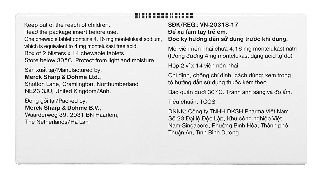 - Hoạt chất chính: 4,16mg montelukast natri có tương đương phân tử với 4,0mg gốc acid tự do.