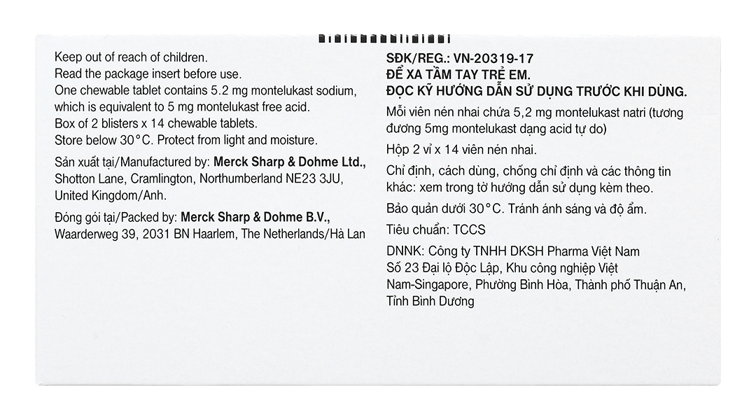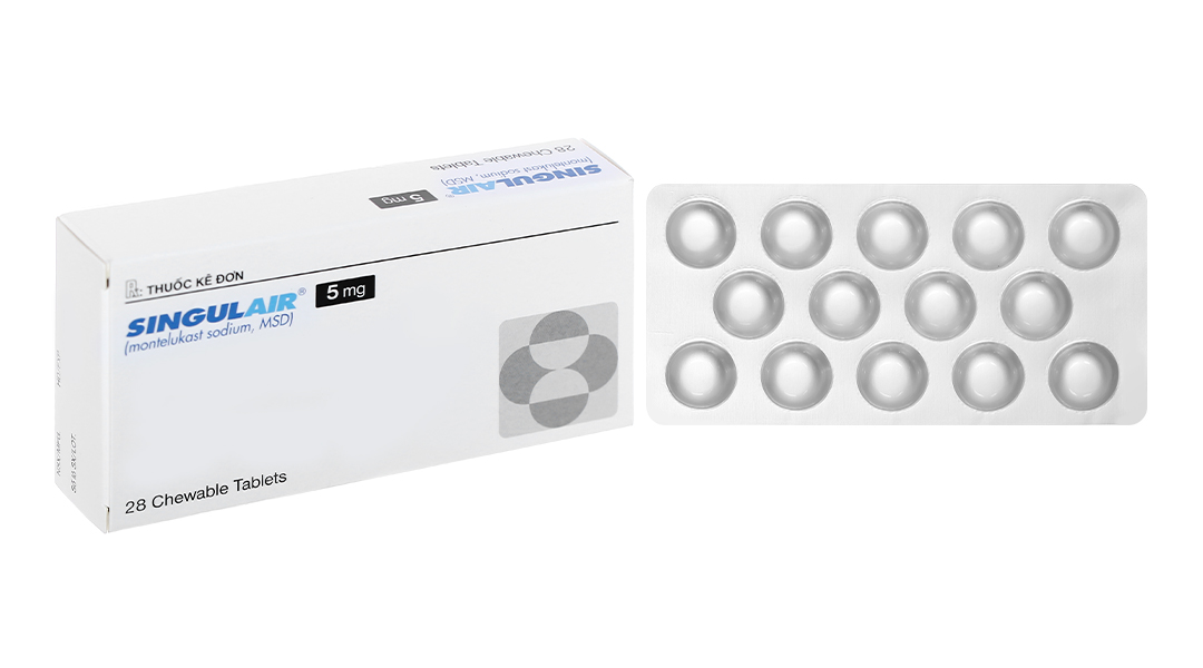Viên nhai Singulair 5mg dự phòng và trị hen phế quản mạn tính (2 vỉ x 14 viên)