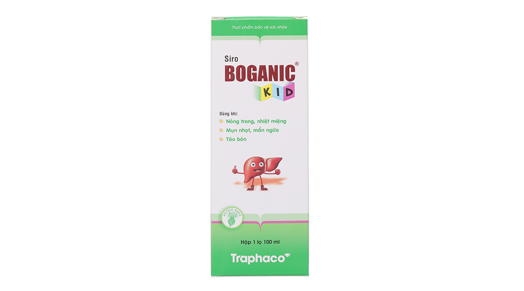 - Boganic Kid là thực phẩm hỗ trợ cải thiện sức khỏe đem lại tác dụng đặc biệt trong việc giúp làm mát gan, tiêu độc, giảm các triệu chứng do nóng trong cũng như làm giảm táo bón. Sản phẩm được bào chế dưới dạng dạng siro dễ uống, tiện lợi, phù hợp cho cả trẻ nhỏ và người trưởng thành.