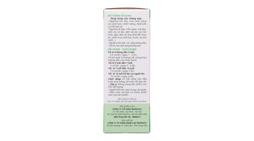 - Trẻ từ 6 tháng đến 2 tuổi: 2,5 ml/lần, ngày 1 – 2 lần. Với trẻ dưới 12 tháng tuổi: Dùng theo hướng dẫn của thầy thuốc.