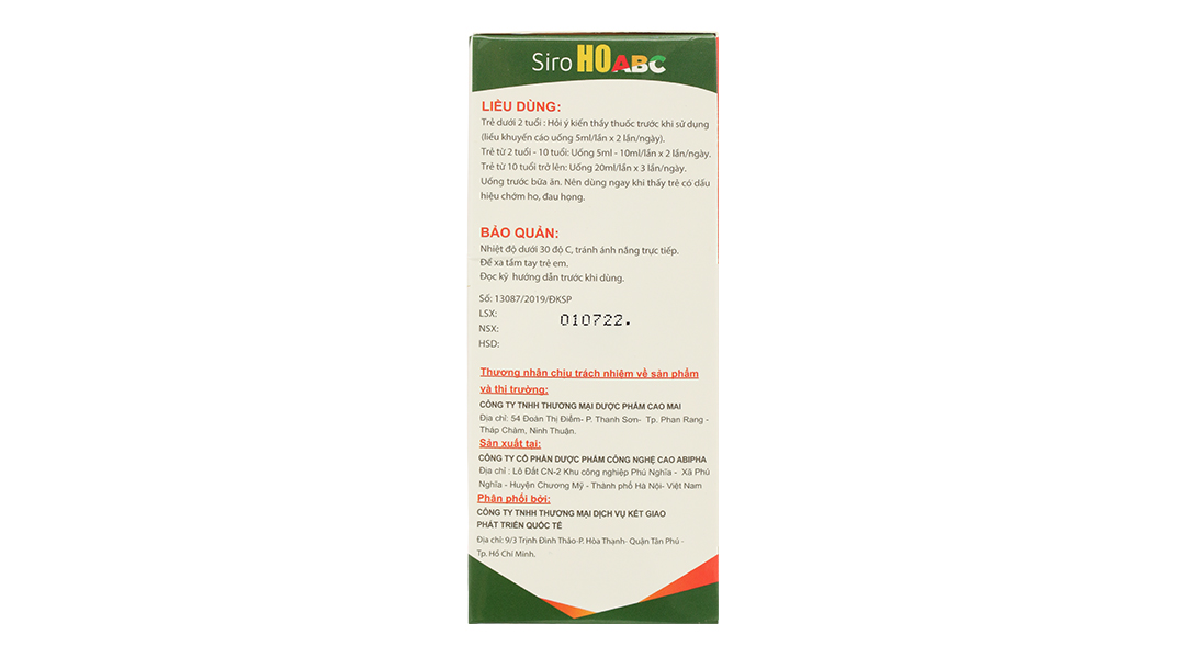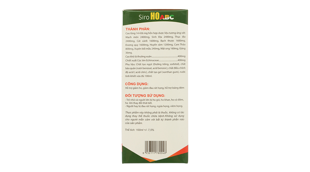 - Siro ho ABC là sản phẩm thực phẩm chức năng được bào chế từ các dược liệu thiên nhiên, giúp hỗ trợ giảm ho, giảm đau rát họng và làm loãng đờm hiệu quả. Với công thức đặc biệt chứa hỗn hợp các thảo dược quý như Mạch môn, Thục địa, Cát cánh, Bạch thược, Đương quy, Gừng, chiết xuất lá thường xuân,… Siro ho ABC mang lại một giải pháp tự nhiên, an toàn và hiệu quả cho các vấn đề về đường hô hấp.