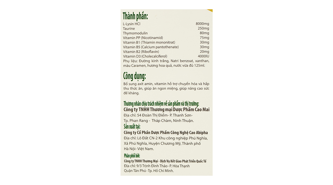 - L-Lysin HCl: Kích thích enzym tiêu hóa, giúp trẻ ăn ngon miệng, gia tăng chuyển hóa và hấp thu tối đa các chất dinh dưỡng. Đồng thời, giúp cơ thể tăng cường sức đề kháng và chống lại với bệnh tật.