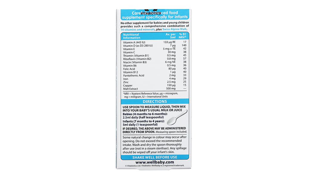 Wellbaby Multi-vitamin Liquid từ Vitabiotics là một giải pháp dinh dưỡng được nghiên cứu kỹ lưỡng để đáp ứng nhu cầu phát triển nhanh chóng của trẻ từ 4 tháng đến 4 tuổi. Với hơn 50 năm kinh nghiệm trong lĩnh vực nghiên cứu và phát triển các công thức bổ sung vi chất dinh dưỡng, Vitabiotics cam kết mang đến sản phẩm an toàn, hiệu quả, và được sản xuất dựa trên các nghiên cứu khoa học tiên tiến nhất. Đây là sự lựa chọn lý tưởng cho các bậc phụ huynh mong muốn bổ sung vitamin và khoáng chất thiết yếu để hỗ trợ sự phát triển toàn diện của con yêu.