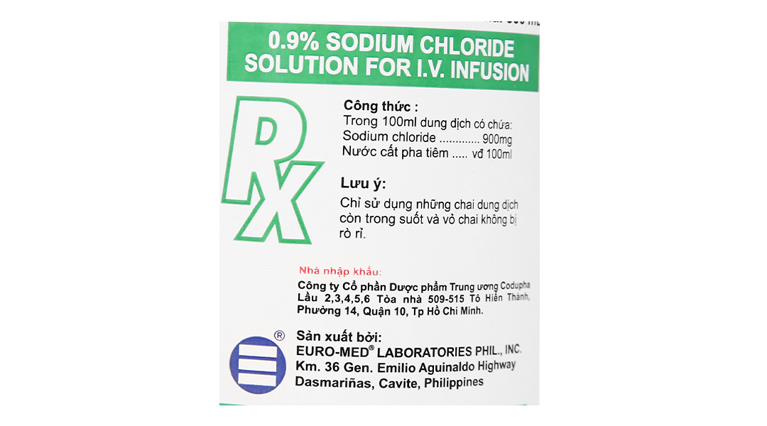 Công dụngBổ sung Natri clorid & nước trong trường hợp mất nước, làm dung môi pha tiêm,...