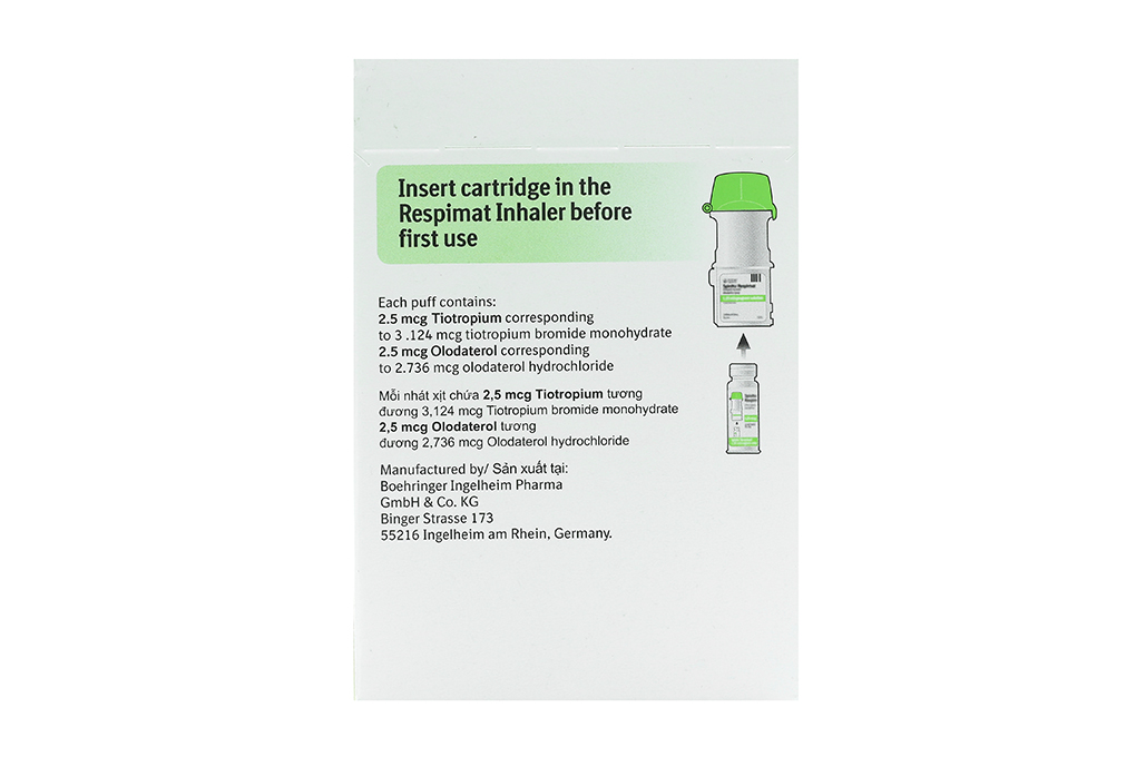 - Mỗi nhát xịt: Tiotropium 2,5 microgam, olodaterol 2,5 microgram (2 nhát xịt tương ứng với một liều), tương đương 3,124 microgram tiotropium bromide monohydrate và 2,736 microgram olodaterol hydrochloride.
