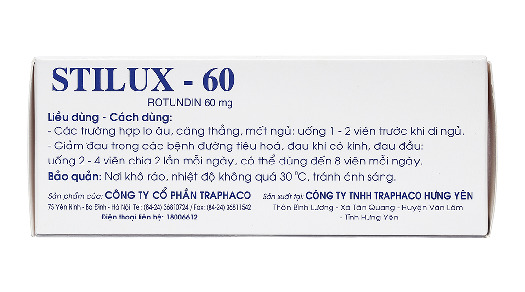 - Stilux – 60 có tác dụng an thần gây ngủ với liều thấp. Giấc ngủ sẽ đến sau 10 – 20 phút sau khi uống thuốc và kéo dài 4 – 6 giờ hoặc có thể lâu hơn tùy liều lượng, sau khi ngủ dậy không có cảm giác mệt mỏi hay nhức đầu.