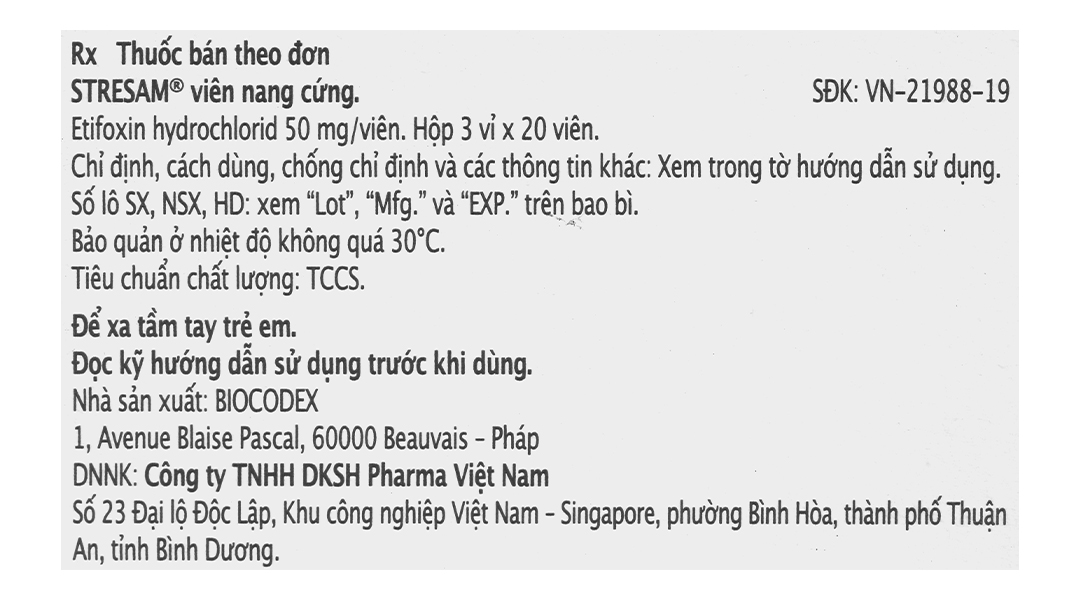 – Hoạt chất: Etifoxine hydrochloride 50mg.