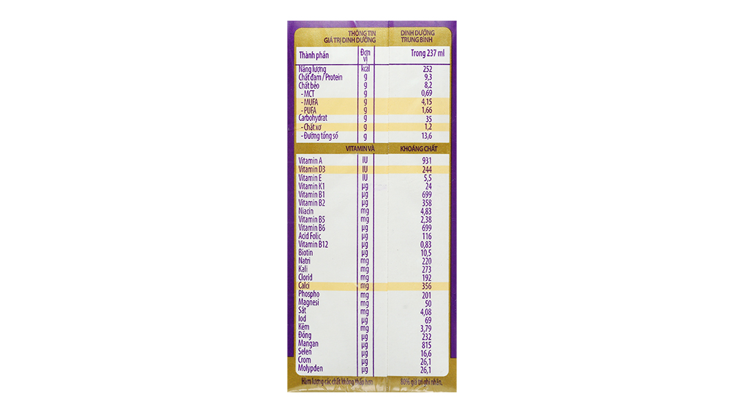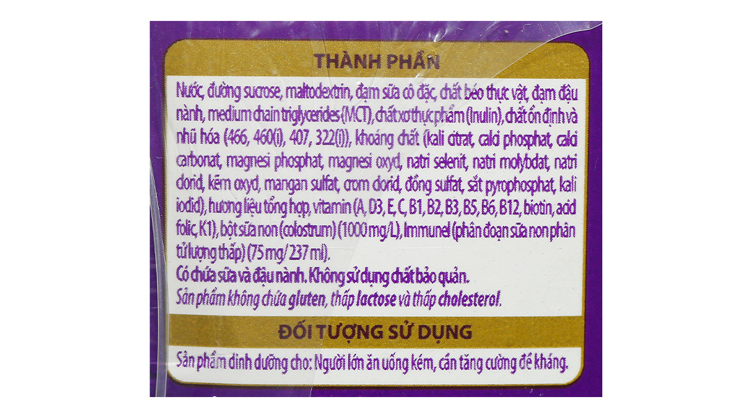 Nước, đường sucrose, maltodextrin, đạm sữa cô đặc, chất béo thực vật, đạm đậu nành, medium chain triglycerides (MCT), chất xơ thực phẩm (Inulin), chất ổn định và nhũ hóa (466, 460(i), 407, 322(i)), khoáng chất (kali citrat, calci phosphat, calci carbonat, magnesi phosphat, magnesi oxyd, natri selenit, natri molybdat, natri clorid, kẽm oxyd, mangan sulfat, crom clorid, đồng sulfat, sắt pyrophosphat, kali iodid), hương liệu tổng hợp, vitamin (A, D3, E, C, B1, B2, B3, B5, B6, B12, biotin, acid folic, K1), bột sữa non (colostrum) (1000mg/L), Immunel (phân đoạn sữa non phân tử lượng thấp) (75mg/237ml).