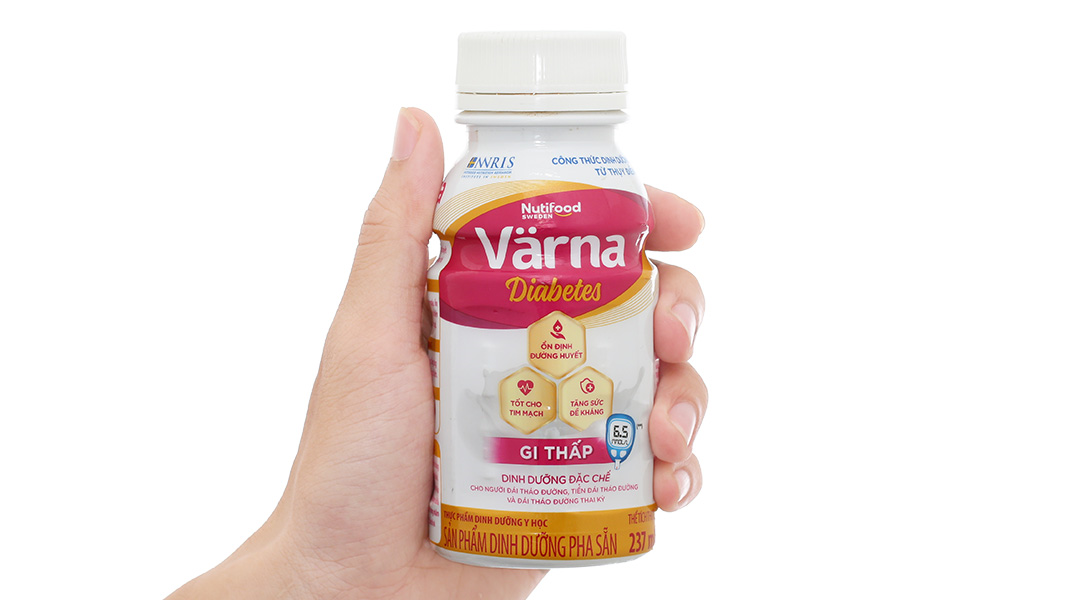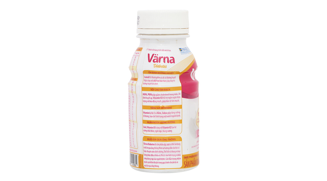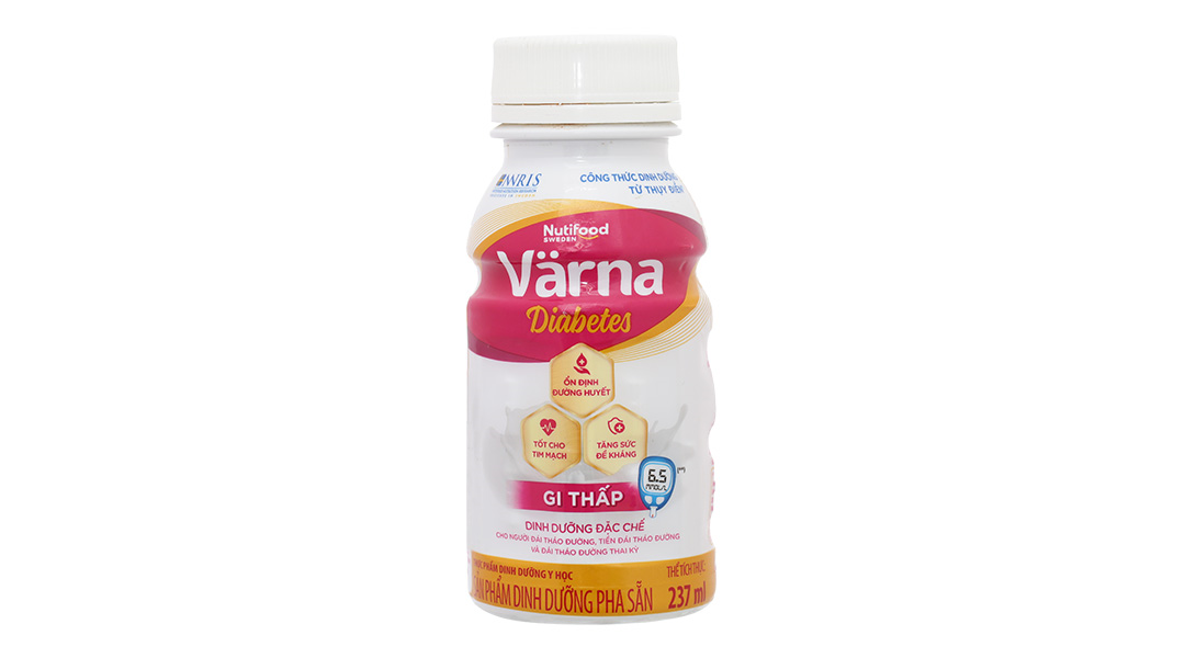 Sữa bột pha sẵn Nutifood Varna Diabetes chai 237ml được áp dụng công thức đặc chế dưới sự giám sát của Viện Nghiên Cứu Dinh Dưỡng NutiFood Thụy Điển – NNRIS, sản phẩm có chỉ số GI thấp (GI = 26,9), giúp ổn định đường huyết, tốt cho tim mạch và tăng cường đề kháng. Đây là công thức được đúc kết từ hơn 20 năm nghiên cứu và tìm hiểu về nhu cầu dinh dưỡng đặc thù của người bệnh đái tháo đường, tiền đái tháo đường, đái tháo đường thai kỳ tại Việt Nam bởi các chuyên gia dinh dưỡng hàng đầu của Nutifood.