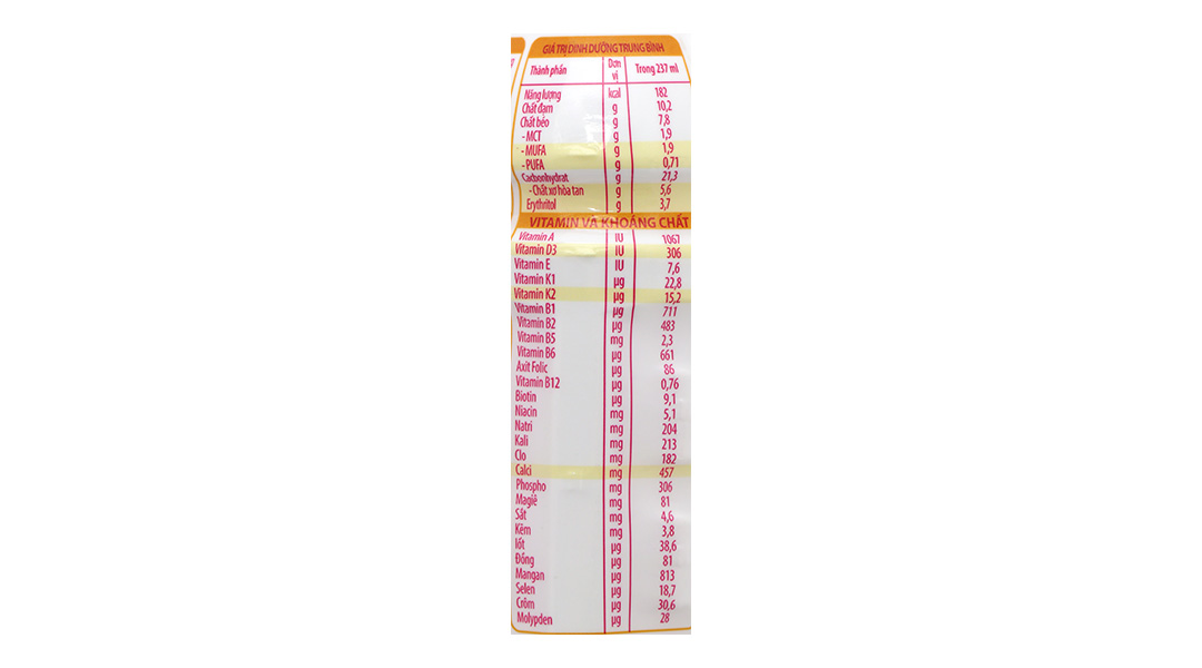 Nước, đạm sữa cô đặc, chất béo thực vật, maltodextrin, đường erythritol, đường isomalt (1,5%), medium chain triglycerides (MCT), đạm đậu nành, chất xơ hòa tan (FOS/ Inulin, polydextrose), đường fructose, khoáng chất (calci phosphat, kali citrat, magnesi oxyd, natri selenit, sắt (III) pyrophosphat, mangan sulfat, kẽm oxyd, natri molybdat, crom clorid, kali iodid, natri clorid, nanocanxi (calci carbonat), kali iodat), chất ổn định và nhũ hóa (466, 460(i), 407, 322(i)), hương liệu tổng hợp dùng cho thực phẩm, vitamin (A, D3, C, E, B1, B2, B3, B5, B6, B12, K1, K2, biotin, axit folic), chất tạo ngọt tự nhiên steviol glycosid từ Stevia, chất tạo ngọt tổng hợp sucralose.