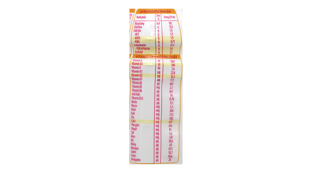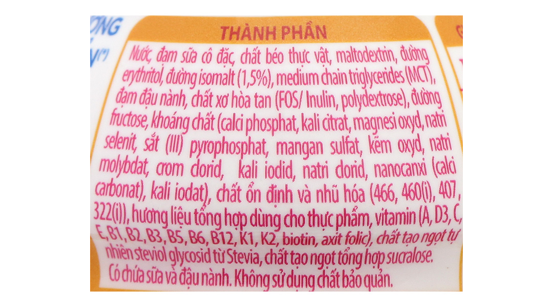 Nước, đạm sữa cô đặc, chất béo thực vật, maltodextrin, đường erythritol, đường isomalt (1,5%), medium chain triglycerides (MCT), đạm đậu nành, chất xơ hòa tan (FOS/ Inulin, polydextrose), đường fructose, khoáng chất (calci phosphat, kali citrat, magnesi oxyd, natri selenit, sắt (III) pyrophosphat, mangan sulfat, kẽm oxyd, natri molybdat, crom clorid, kali iodid, natri clorid, nanocanxi (calci carbonat), kali iodat), chất ổn định và nhũ hóa (466, 460(i), 407, 322(i)), hương liệu tổng hợp dùng cho thực phẩm, vitamin (A, D3, C, E, B1, B2, B3, B5, B6, B12, K1, K2, biotin, axit folic), chất tạo ngọt tự nhiên steviol glycosid từ Stevia, chất tạo ngọt tổng hợp sucralose.