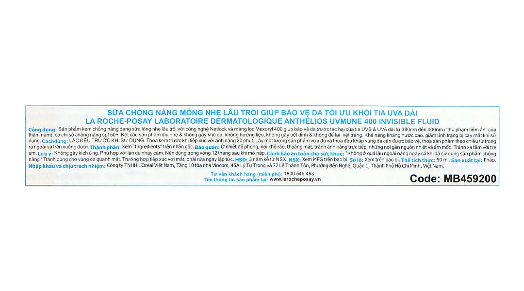Sản phẩm sữa chống nắng lỏng nhẹ lâu trôi với công nghệ NaUock và màng lọc Mexoryl 400 giúp bảo vệ da trước tác hại của tia UVB & UVA dài từ 380nm đến 400nm (“thủ phạm tiềm ẩn” của thâm nám), có chỉ số chống nắng SPF 50+.
