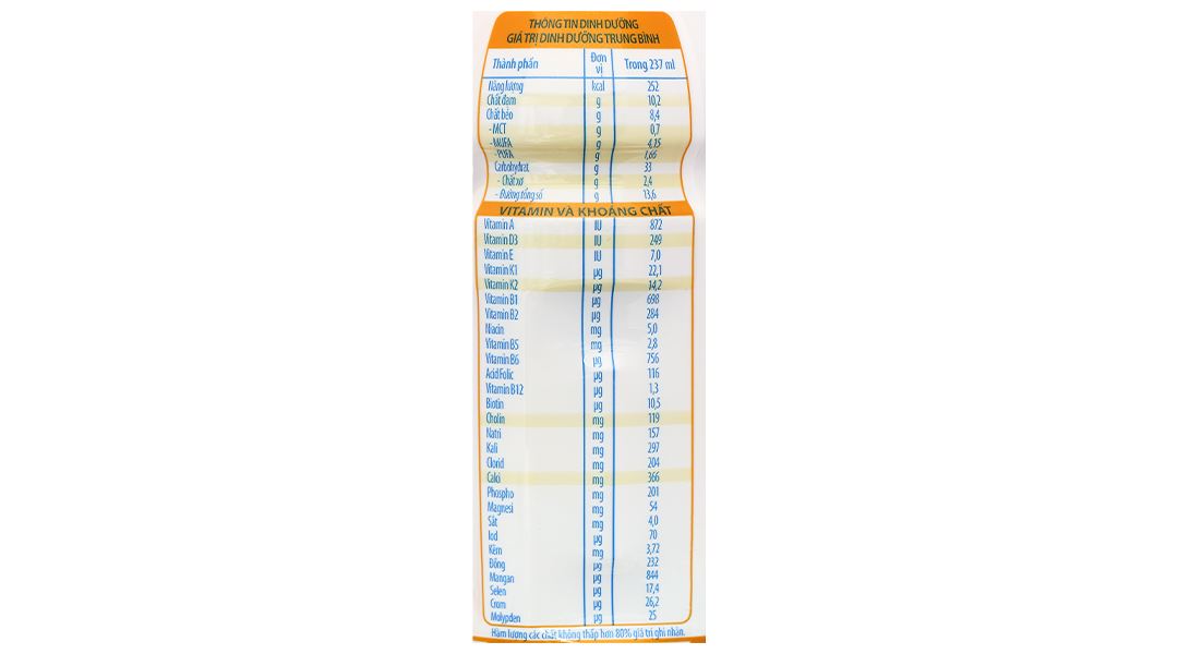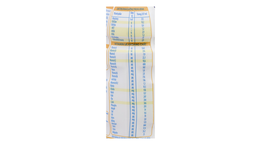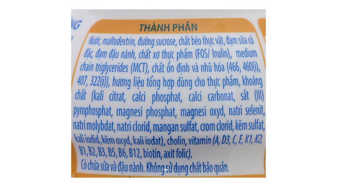 Nước, đường sucrose, maltodextrin, đạm sữa cô đặc, chất béo thực vật, đạm đậu nành, chất xơ thực phẩm (Inulin), medium chain triglycerides (MCT), chất ổn định và nhũ hóa (466, 460(i), 407, 321(i)), hương liệu tổng hợp dùng cho thực phẩm, khoáng chất (kali citrat, calci phosphat, calci carbonat, sắt (III) pyrophosphat, magnesi phosphat, magnesi oxyd, natri selenit, natri molybdat, nari clorid, mangan sulfat, đồng sulfat, crom clorid, kẽm sulfai, kali iodid, kẽm oxyd, kali iodat), cholin, vitamin (A, D3, C, E, K1, K2, B1, B2, B3, B5, B6, B12, biotin, acid folic).