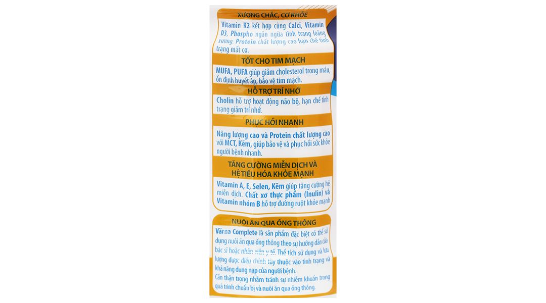 Với hơn 20 năm am hiểu sâu sắc thể trạng và nhu cầu dinh dưỡng đặc thù của người lớn, người ăn uống kém, người bệnh tại Việt Nam từ các chuyên gia dinh dưỡng Nutifood, nay ứng dụng tinh hoa dinh dưỡng Thụy Điển, Värna Complete với công thức chuyên biệt FRP(*) hỗ trợ phục hồi nhanh và phòng ngừa các vấn đề sức khỏe; giúp xương chắc, cơ khỏe; tốt cho tim mạch và hỗ trợ trí nhớ.