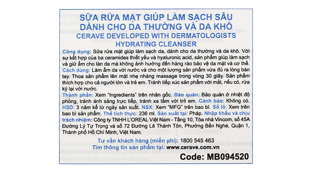 Sữa rửa mặt CeraVe Hydrating Cleanser sạch sâu cho da thường và da khô chai 236ml