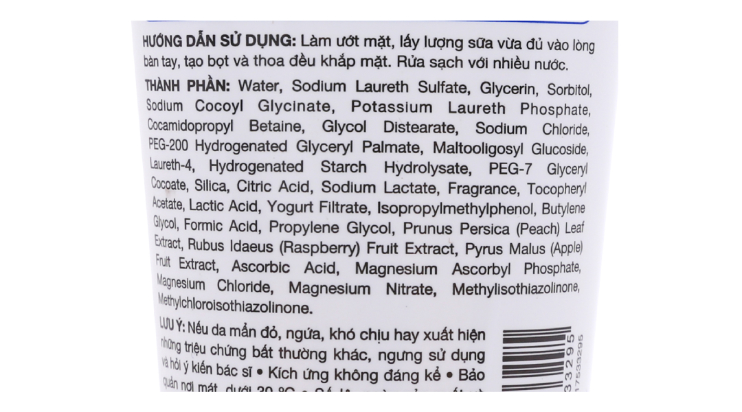 Sữa rửa mặt gồm các thành phần: Water, Sodium Laureth Sulfate, Glycerin, Sorbitol, Sodium Cocoyl Glycinate, Potassium Laureth Phosphate, Cocamidopropyl Betaine, Glycol Distearate, Sodium Chloride, PEG-200 Hydrogenated Glyceryl Palmate, Maltooligosyl Glucoside, Laureth-4, Hydrogenated Starch Hydrolysate, PEG-7Glyceryl Cocoate, Silica, Citric Acid, Sodium Lactate, Fragrance, Tocopheryl, Acetate, Lactic Acid, Yogurt Filtrate, Isopropylmethylphenol, Butylene Glycol, Formic Acid, Propylene Glycol, Prunus Persica( Peach), Leaf Extract, Rubus Idaeus (Raspberry) Fruit Extract, Pyrus Malus (Apple) Fruit Extract, Ascorbic Acid, Magnesium Ascorbyl Phosphate, Magnesium Chloride, Magnesium Nitrate, Methylisothiazolinone, Methylchloroisothiazolinone.