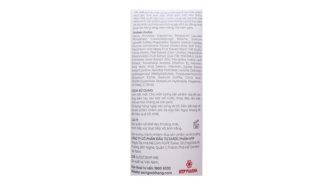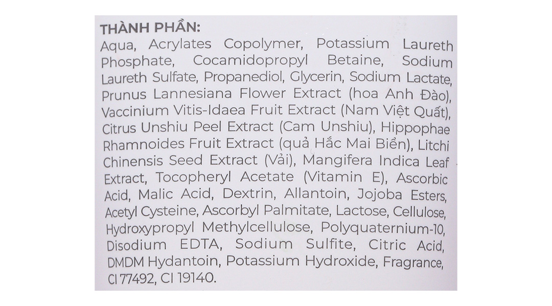 Thành phần chínhChiết xuất hoa Anh Đào Nhật Bản, Hắc Mai Biển, Nam Việt Quất, Vải, Cam Unshiu cùng các hạt tinh thể Vitamin E
