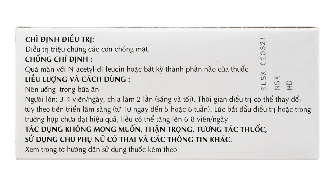 - Thành phần dược chất: N-Acetyl-DL-Leucin 500 mg