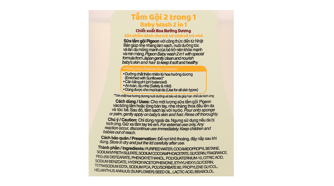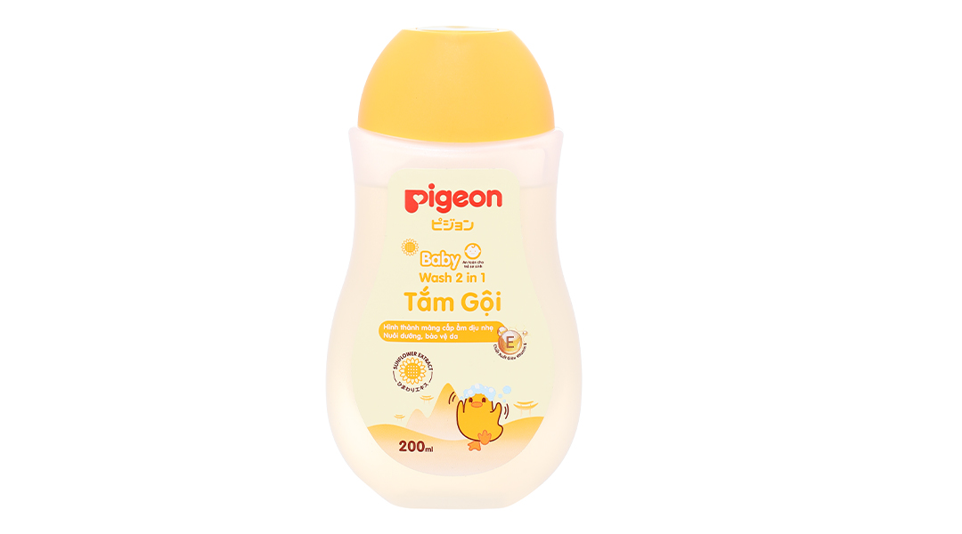 – Dung dịch tắm gội dịu nhẹ (2 trong 1) Pigeon chiết xuất từ dầu hoa hướng dương là sự kết hợp của dầu gội và sữa tắm trong cùng một sản phẩm giúp nhẹ nhàng làm sạch tóc, da đầu và toàn thân bé mà vẫn giữ được các chất nhờn sinh lý tự nhiên trên da.