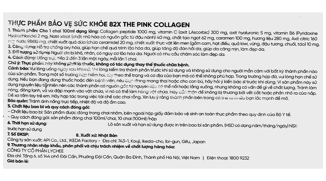 - Ceramide: Lipid nội bào chính để lấp đầy các khoảng trống ở bên trong của da, đồng thời mang đến hương vị thơm ngon cho 82X The Pink Collagen.