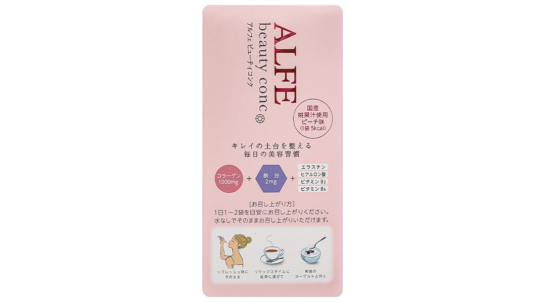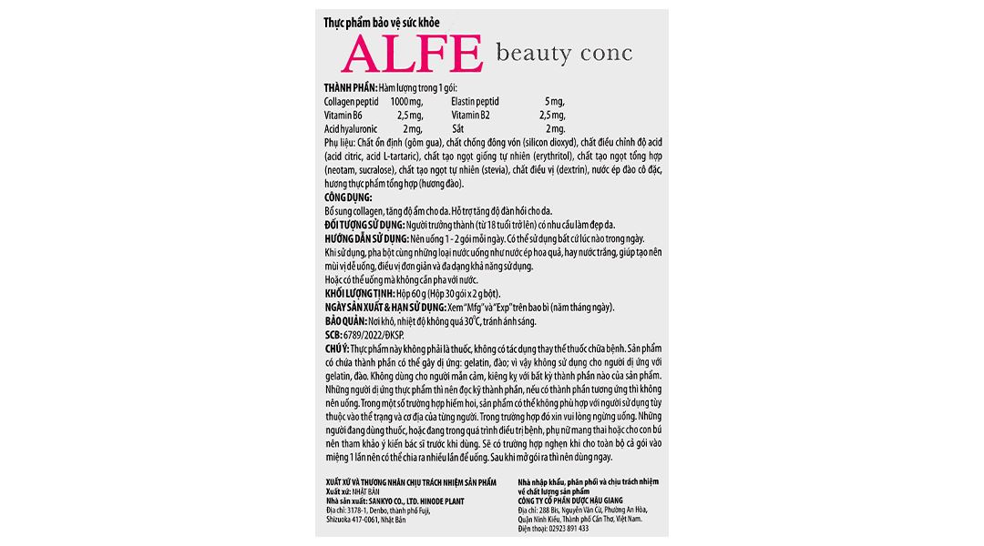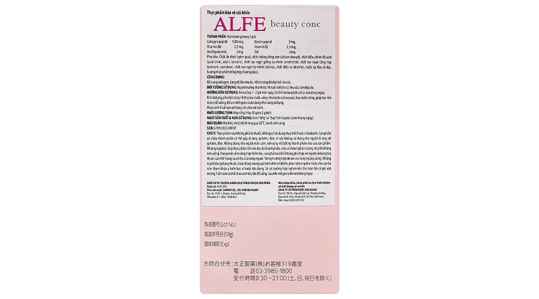 - Sản phẩm cung cấp đến 1000mg Collagen thủy phân giúp làn da được cung cấp đủ dưỡng chất để phục hồi, tăng độ đàn hồi và giảm thiểu nếp nhăn. Collagen thủy phân trong ALFE Beauty Conc dễ dàng thẩm thấu vào cơ thể hơn, giúp làm săn chắc da và mang lại làn da mịn màng, căng bóng từ bên trong.