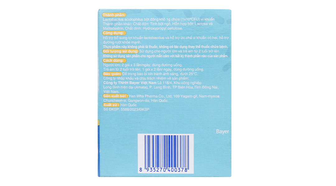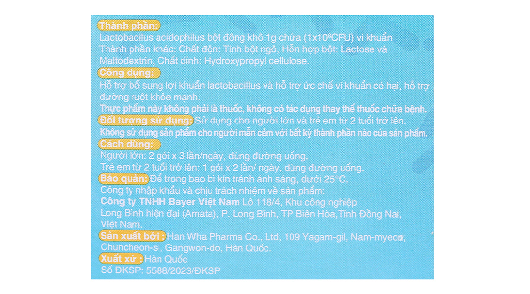 Công dụngHỗ trợ bổ sung lợi khuẩn lactobacillus và hỗ trợ ức chế vi khuẩn có hại