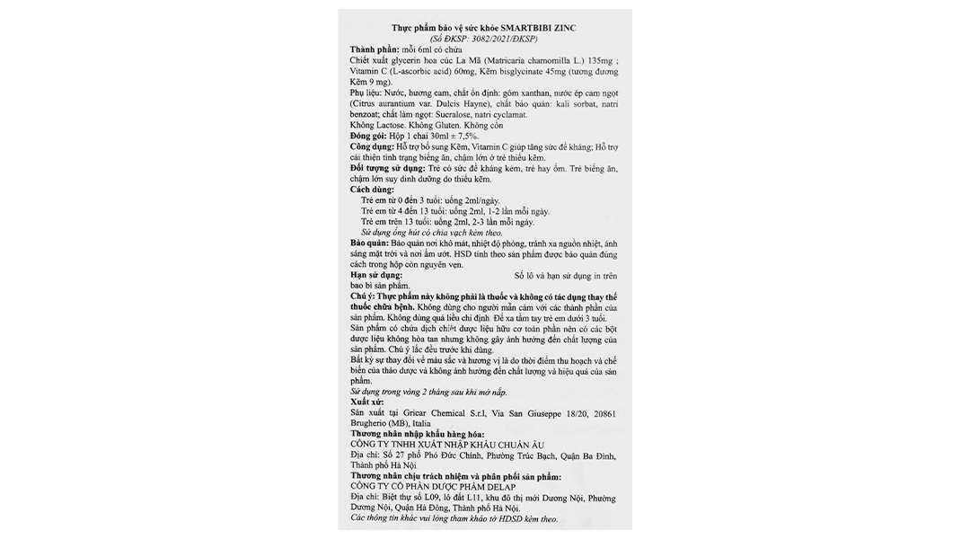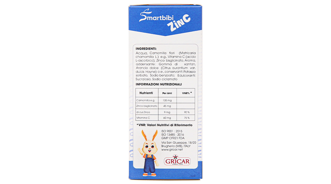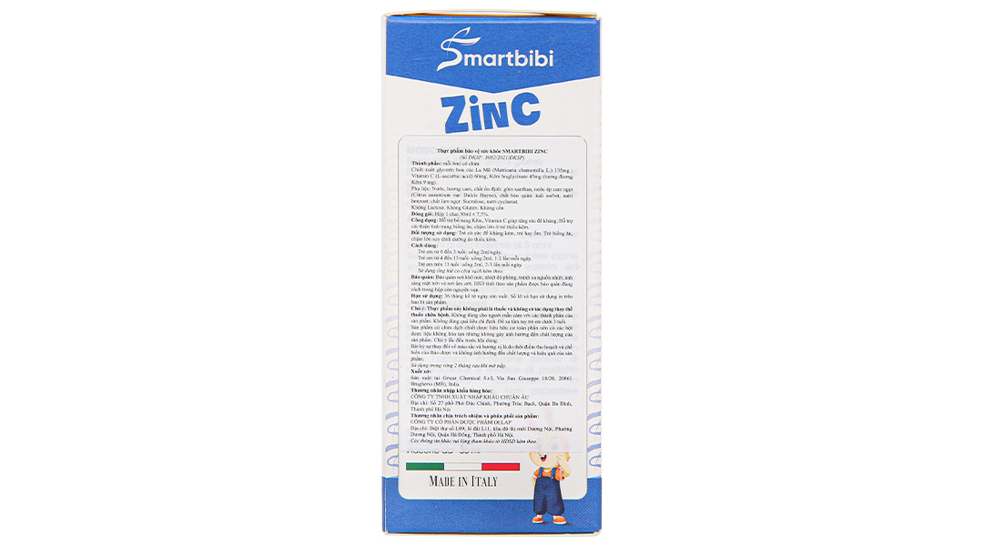 - Smartbibi Zinc là sản phẩm của thương hiệu Gricar, một trong những nhà sản xuất thực phẩm bảo vệ sức khỏe hàng đầu châu Âu, với hơn 50 năm kinh nghiệm trong ngành. Gricar luôn chú trọng đến việc sử dụng nguồn nguyên liệu tự nhiên, an toàn và chất lượng, đặc biệt là đối với sức khỏe của trẻ em. Smartbibi Zinc có công thức giúp bổ sung kẽm chelate hữu cơ dạng bisglycinate, kết hợp với vitamin C, giúp tăng cường sức đề kháng và hỗ trợ sự phát triển khỏe mạnh cho trẻ.