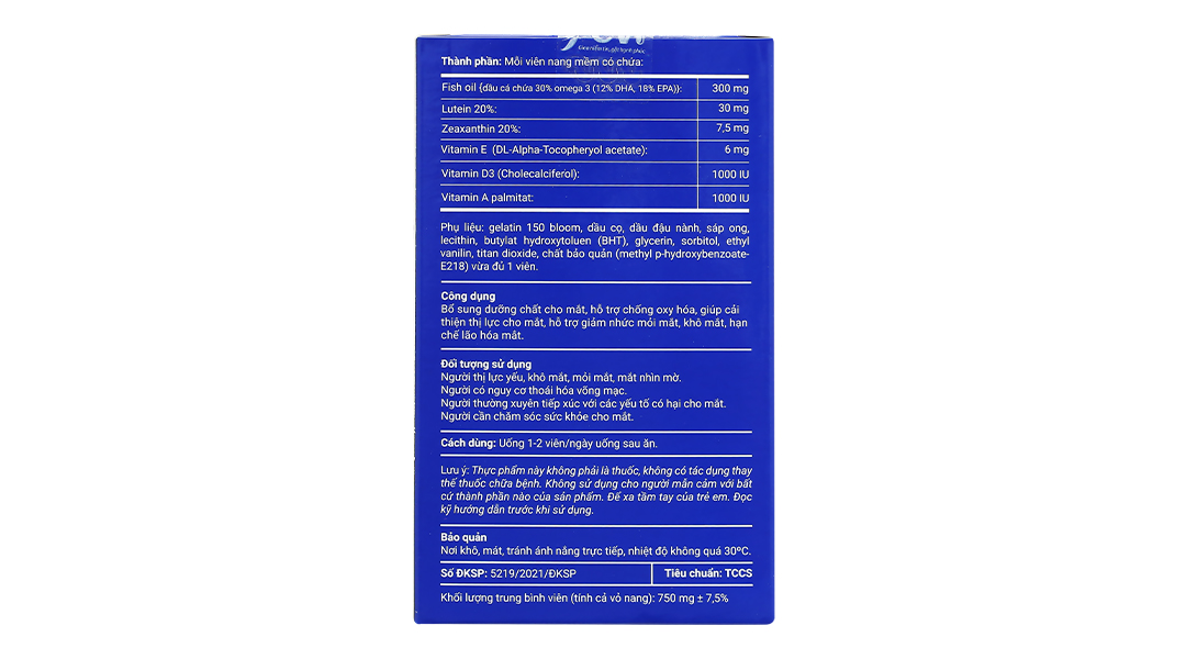 - Fish oil (dầu có chứa 30% omega 3 (12% DHA, 18% EPA)): DHA, EPA trong dầu cá có vai trò quan trọng trong sự phát triển của mắt, chống thoái hóa điểm vàng, giảm nguy cơ tăng nhãn áp và cải thiện thị lực. Hỗ trợ giảm khô mắt, mỏi mắt, đau mắt cho những người văn phòng dùng máy tính, điện thoại, xem tivi nhiều.