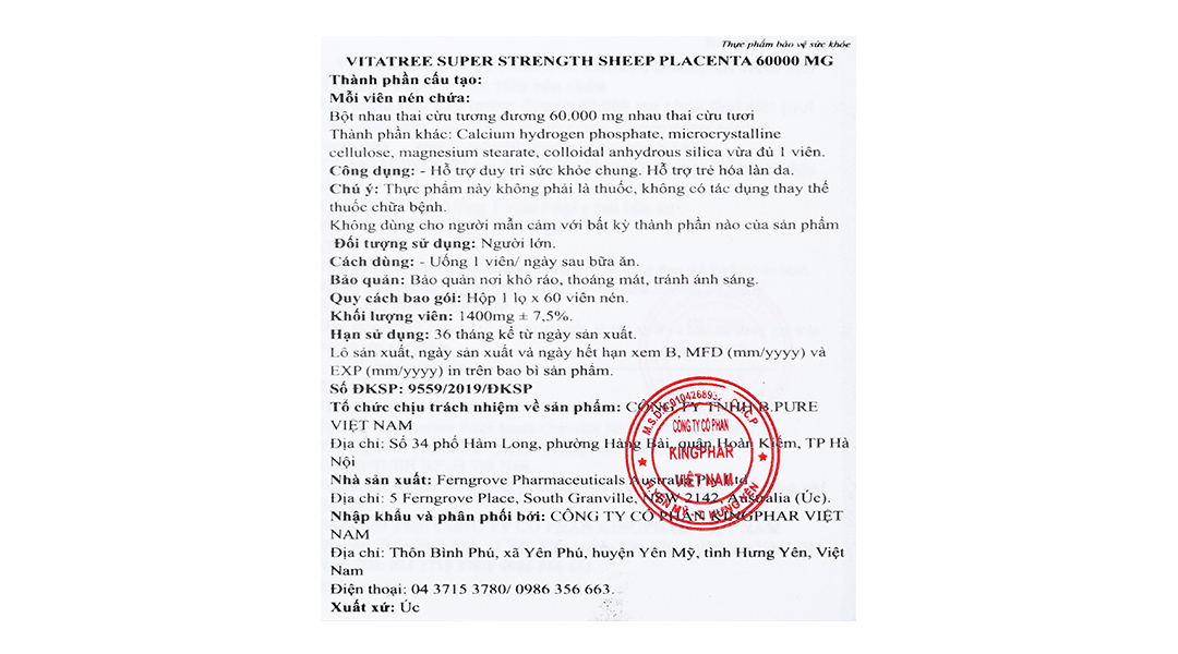 Mỗi viên nén chứa: Bột nhau thai cừu tương đương 60.000mg nhau thai cừu tươi.