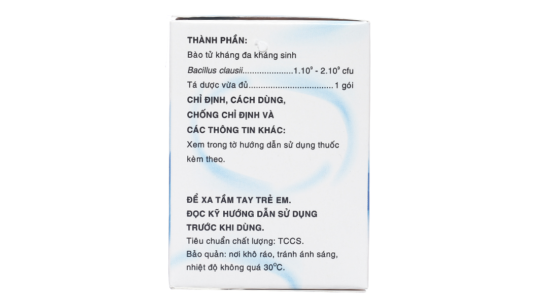 Hoạt chất: Bào tử kháng đa kháng sinh Bacillus clausii 1.109 – 2.109 CFU