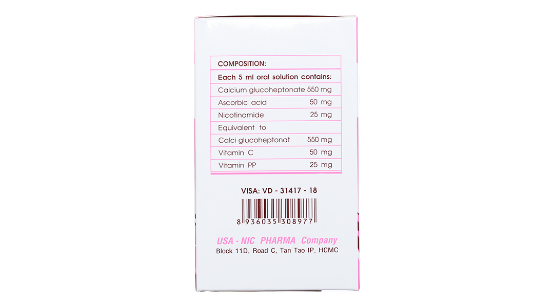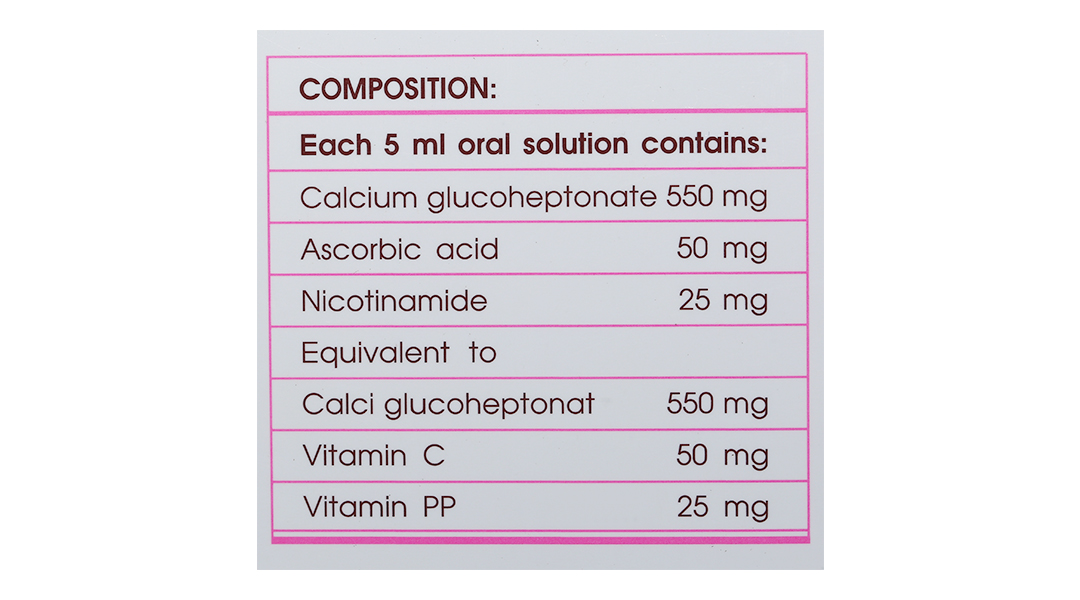 Hoạt chất: Calcium glucoheptonate 550mg, Ascorbic acid 50mg, Nicotinamide 25mg.
