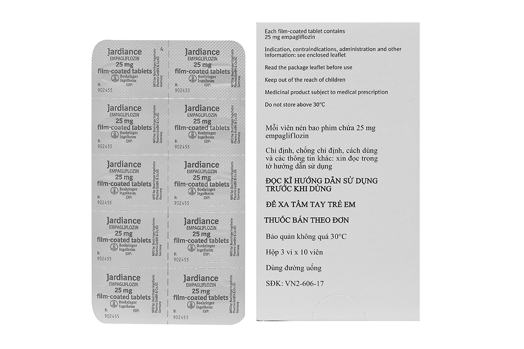 – Cảnh báo và thận trọng khi dùng thuốcNhiễm toan xê tôn Các trường hợp nhiễm toan xê tôn, bao gồm các trường hợp đe dọa đến tính mạng và tử vong, đã được báo cáo ở bệnh nhân đái tháo đường được điều trị bằng các thuốc ức chế SGLT2 bao gồm empagliflozin. Trong một vài trường hợp, tình trạng này xuất hiện một cách không điển hình, chỉ với sự tăng trung bình glucose trong máu, dưới 14 mmol/L (250mg/dL). Không biết được liệu nhiễm toan xê tôn có xảy ra nhiều hơn với liều empagliflozin cao hơn hay không. Mặc dù nhiễm toan xê tôn dường như ít xảy ra trên bệnh nhân không bị đái tháo đường, đã có báo cáo về các trường hợp nhiễm toan xê tôn ở những bệnh nhân này. Phải xem xét đến nguy cơ nhiễm toan xê tôn khi thấy các triệu chứng không điển hình như nôn, buồn nôn, chán ăn, đau bụng, khát nhiều, khó thở, lẫn lộn, mệt mỏi bất thường hay buồn ngủ. Nếu các triệu chứng trên xuất hiện, phải đánh giá toan xê tôn cho bệnh nhân ngay lập tức, bất kể mức đường huyết. Nếu nghi ngờ hoặc chẩn đoán bệnh nhân có nhiễm toan xê tôn, nên ngừng dùng empagflozin ngay lập tức. Nên tạm ngừng điều trị ở những bệnh nhân nhập viện để làm các phẫu thuật lớn hoặc bị các căn bệnh nặng cấp tính. Khuyến cáo theo dõi mức xê tôn ở những bệnh nhân này. Đo nồng độ xê tôn trong máu được ưu tiên hơn trong nước tiểu. Có thể bắt đầu sử dụng lại empagliflozin khi nồng độ xê tôn ở mức bình thường và tình trạng bệnh nhân ổn định. Trước khi điều trị với empagliflozin, nên xem xét đến các yếu tố trong bệnh sử của bệnh nhân có thể dẫn tới toan xê tôn. Không khuyến cáo sử dụng lại các thuốc ức chế SGLT2 ở những bệnh nhân trước đó đã bị nhiễm toan xê tôn trong khi đang dùng thuốc ức chế SGLT2, trừ khi xác định rõ ràng do nguyên nhân khác và đã giải quyết được nguyên nhân đó. Không nên sử dụng JARDIANCE để điều trị bệnh nhân đái tháo đường týp 1. Dữ liệu từ một nghiên cứu lâm sàng trên bệnh nhân đái tháo đường týp 1 cho thấy có sự gia tăng nhiễm toan xê tôn xảy ra với tần suất phổ biến trên nhóm bệnh nhân sử dụng empagliflozin 10mg hoặc 25mg thêm với insulin so với nhóm giả dược. Viêm cân mạc hoại tử vùng đáy chậu (hoại tử Fournier) Đã có báo cáo về các trường hợp viêm cân mạc hoại tử vùng đáy chậu (hay còn gọi là hoại tử Fournier), một dạng nhiễm khuẩn hoại tử hiếm gặp nhưng nghiêm trọng và đe dọa đến tính mạng, trên bệnh nhân đái tháo đường nam và nữ đang điều trị bằng các thuốc ức chế SGLT2 bao gồm Empagliflozin. Hậu quả nghiêm trọng bao gồm nhập viện, đa phẫu và tử vong. Bệnh nhân đang được điều trị bằng Jardiance nếu xuất hiện đau hoặc tấy, đỏ, sưng bộ phận sinh dục hoặc vùng đáy chậu, sốt, mệt mỏi thì cần được đánh giá bệnh viêm cân mạc hoại tử. Nếu nghi ngờ mắc bệnh, cần ngừng thuốc Jardiance và nhanh chóng điều trị (bao gồm dùng kháng sinh phổ rộng và phẫu thuật cắt bỏ phần mô bị nhiễm trùng nếu cần thiết). Suy thận Hiệu quả và tính an toàn của Jardiance trong kiểm soát đường huyết được đánh giá trong một nghiên cứu trên bệnh nhân đái tháo đường týp 2 có suy thận mức độ vừa và nhẹ (eGFR từ 30 đến < 90 mL/phút/1,73m2). Trong nghiên cứu này, 195 bệnh nhân dùng Jardiance có eGFR trong khoảng 60–90 mL/phút/1,73m2, 91 bệnh nhân dùng Jardiance có eGFR trong khoảng 45-60 mL/phút/1,73m2, và 97 bệnh nhân dùng Jardiance có eGFR trong khoảng 30-45 mL/phút/1,73m2. Lợi ích trên việc giảm đường huyết của Jardiance 25mg giảm trên bệnh nhân có chức năng thận suy giảm. Các nguy cơ suy thận, giảm thể tích, tác dụng không mong muốn và các tác dụng không mong muốn liên quan đến nhiễm khuẩn đường tiết niệu tăng khi chức năng thận suy giảm. Không khuyến cáo sử dụng Jardiance để kiểm soát đường huyết trên bệnh nhân không có sẵn bệnh lý tim mạch hoặc các yếu tố nguy cơ tim mạch cao khi eGFR < 30 mL/phút/1,73m2. JARDIANCE đã được đánh giá trên 7020 bệnh nhân trưởng thành đái tháo đường týp 2 và có sẵn bệnh lý tim mạch (eGFR ≥ 30 mL/phút/1,73m2) trong nghiên cứu EMPA-REG OUTCOME, trên tổng số 9718 bệnh nhân suy tim (eGFR ≥ 20 mL/phút/1,73m2) trong nghiên cứu EMPEROR-Reduced và EMPEROR-Preserved, và trên 6609 bệnh nhân trưởng thành suy thận mạn (eGFR từ 20-90 mL/phút/1,73m2) trong nghiên cứu EMPA-KIDNEY. Hồ sơ về tính an toàn của các phân nhóm theo mức eGFR trong các nghiên cứu này nhất quán với hồ sơ an toàn đã biết. Các nghiên cứu về hiệu quả và tính an toàn của JARDIANCE không thu nhận các bệnh nhân có eGFR < 20 mL/phút/1,73 m2 hoặc lọc thận. Khi đã được thu nhận vào nghiên cứu, bệnh nhân trưởng thành trong các nghiên cứu EMPA-REG OUTCOME, EMPEROR-Reduced, EMPEROR-Preserved và EMPA-KIDNEY không yêu cầu ngưng điều trị vì lý do eGFR giảm xuống dưới 20 mL/phút/1,73 m2 hoặc bắt đầu phải lọc thận. Theo dõi chức năng thận Khuyến cáo đánh giá chức năng thận trước 