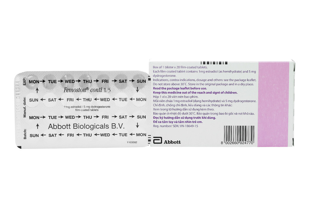 Femoston conti chứa 1mg 17β-estradiol (hemihydrat) và 5mg dydrogesterone.