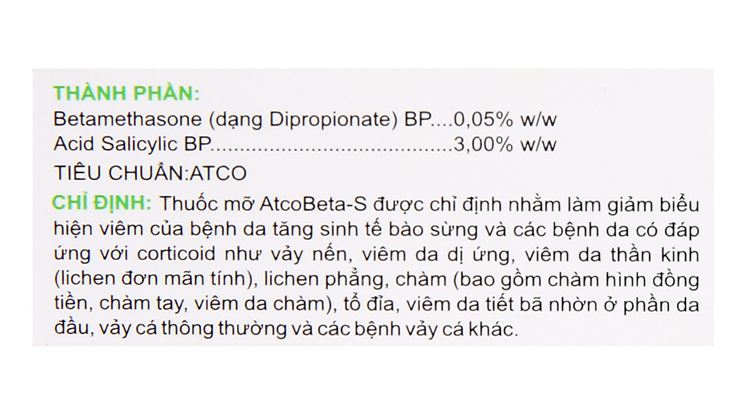 Thuốc mỡ AtcoBeta-S được chỉ định nhằm làm giảm biểu hiện viêm của bệnh da tăng sinh tế bào sừng và các bệnh da có đáp ứng với corticoid như vảy nến, viêm da dị ứng, viêm da thần kinh (lichen đơn mãn tính), lichen phẳng, chàm (bao gồm chàm hình đồng tiền, chàm tay, viêm da chàm), tổ đỉa, viêm da tiết bã nhờn ở phần da đầu, vảy cá thông thường và các bệnh vảy cá khác.