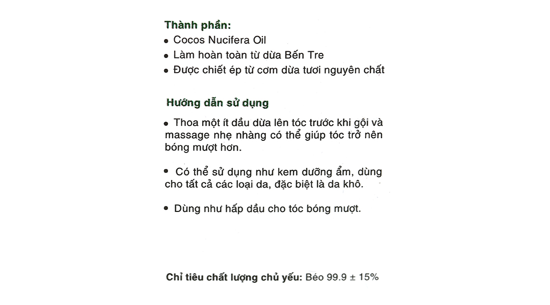 Cocos Nucifera Oil, làm hoàn toàn từ dừa Bến Tre, được chiết ép từ cơm dừa tươi nguyên chất.