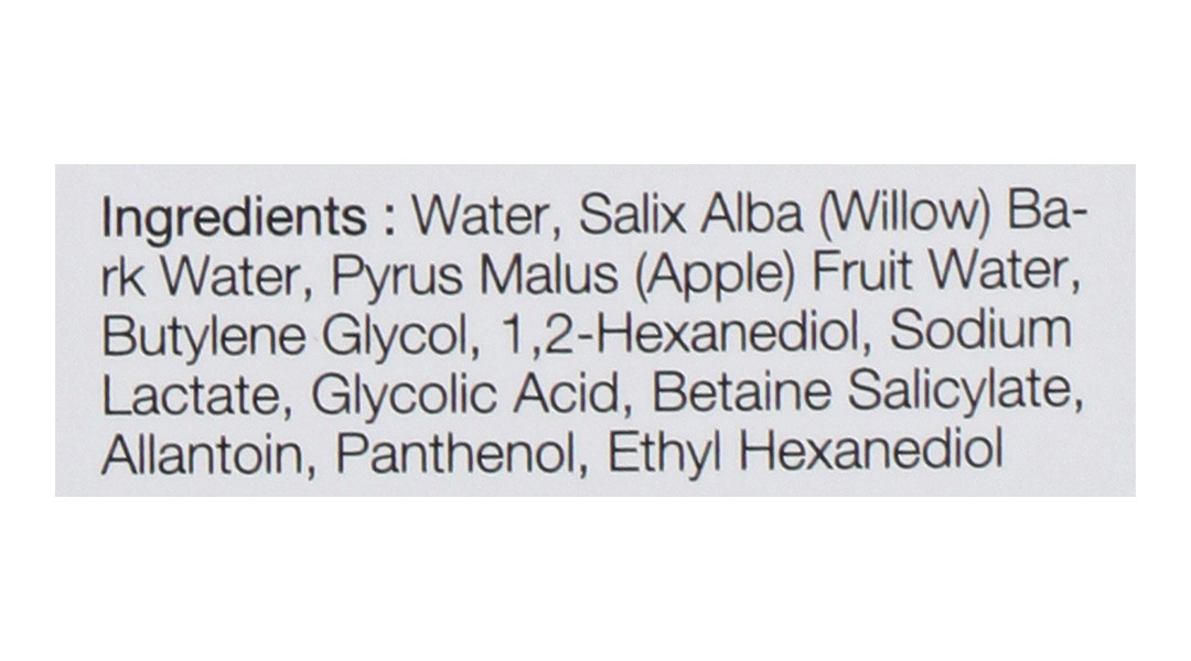 Water, Salix Alba (Willow) Ba- rk Water, Pyrus Malus (Apple) Fruit Water, Butylene Glycol, 1,2-Hexanediol, Sodium Lactate, Glycolic Acid, Betaine Salicylate, Allantoin, Panthenol, Ethyl Hexanediol.