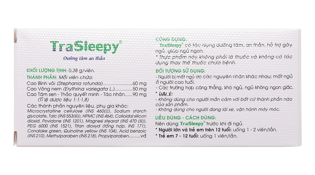 Hiện nay tình trạng mất ngủ đang rất phổ biến, không riêng người lớn tuổi mà còn xu hướng trẻ hoá dần với nhiều nguyên nhân như căng thẳng thần kinh, áp lực do công việc, gia đình; khói bụi tiếng ồn… TraSleepy với thành phần hoàn toàn từ thảo dược hỗ trợ giảm căng thẳng, an thần giúp người dùng có giấc ngủ sâu và trọn vẹn.