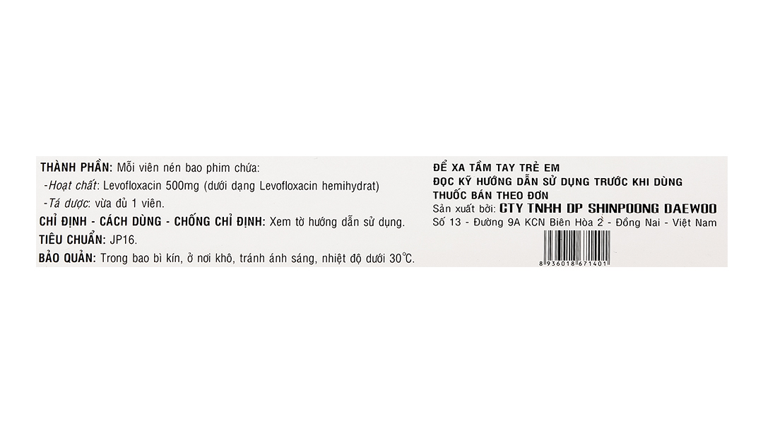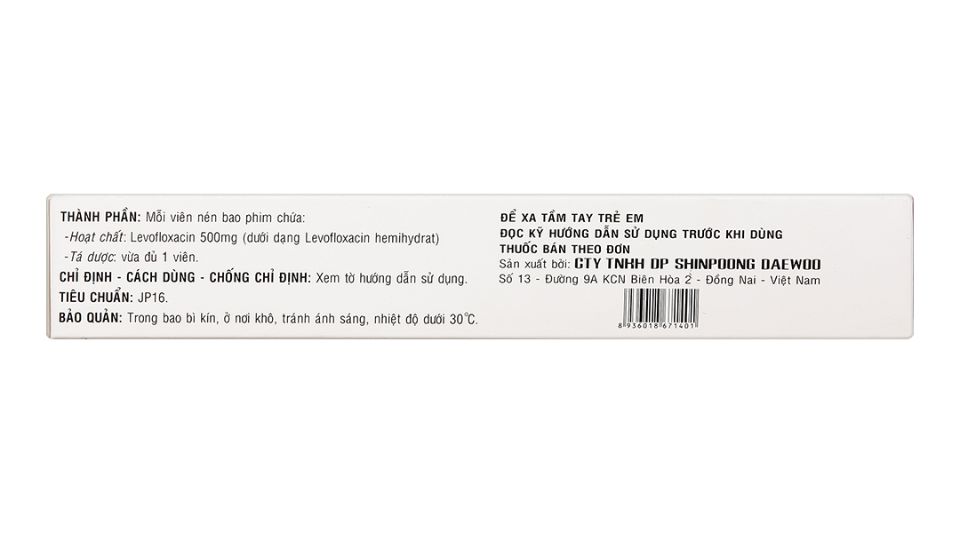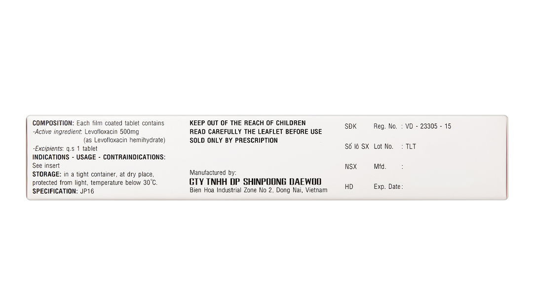 - Levofloxacin: 500mg (dưới dạng Levofloxacin hemihydrat).