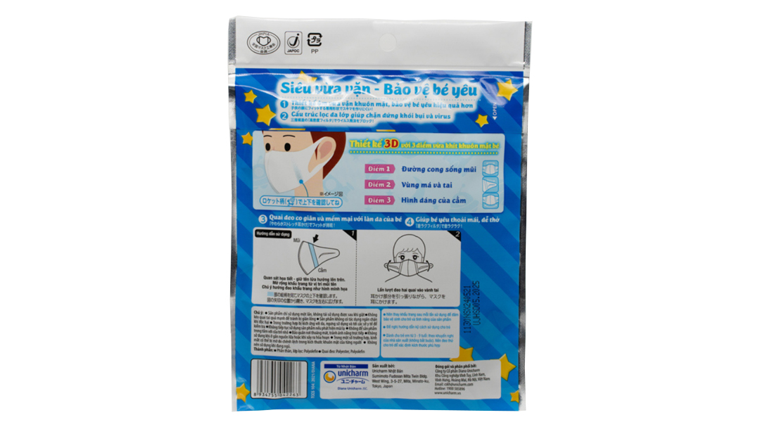 – Sản phẩm khẩu trang trẻ em Unicharm 3D Mask chỉ sử dụng một lần, không tái sử dụng được sau khi giặt.