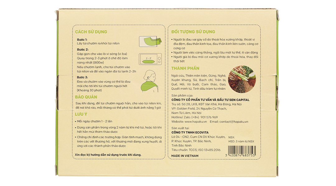 Khuyên dùngKhông chườm lên vùng da niêm mạc hoặc vết thương hở. Bảo quản trong túi nilon kín, nơi khô ráo, tránh ẩm ướt.