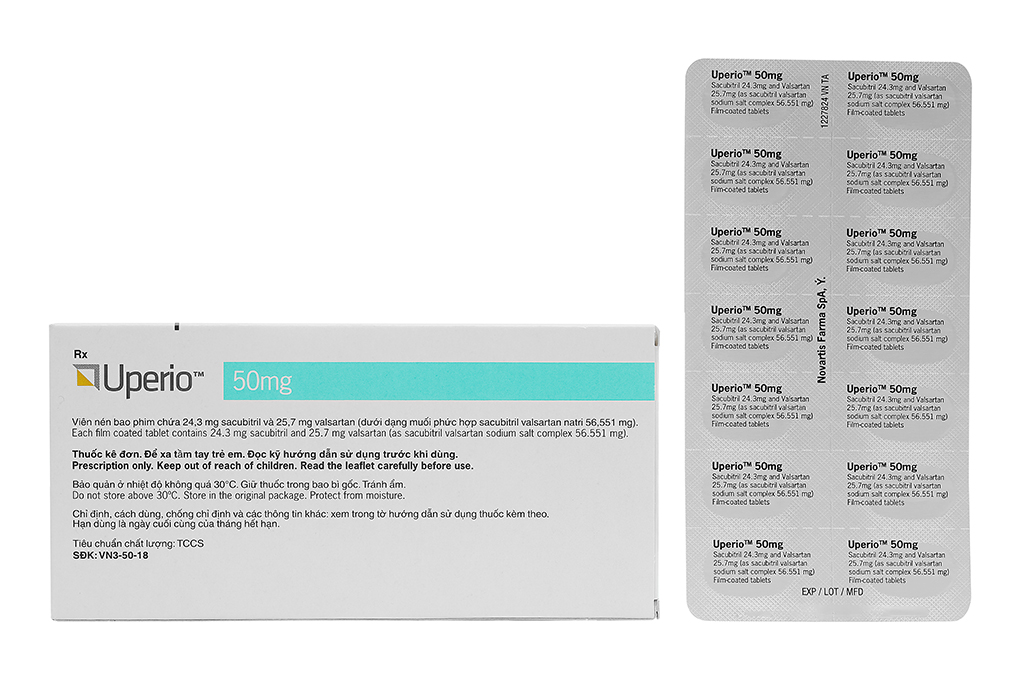 Uperio 50 mg, viên nén bao phim: Mỗi viên nén bao phim bao gồm 24,3 mg sacubitril và 25,7 mg valsartan (dưới dạng muối phức hợp sacubitril valsartan natri 56,551 mg).