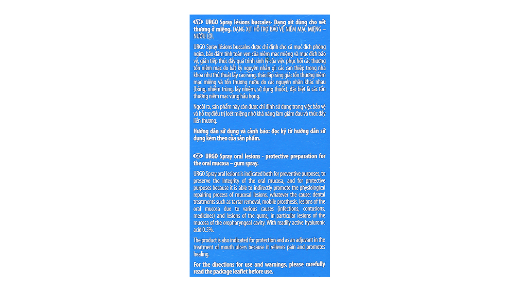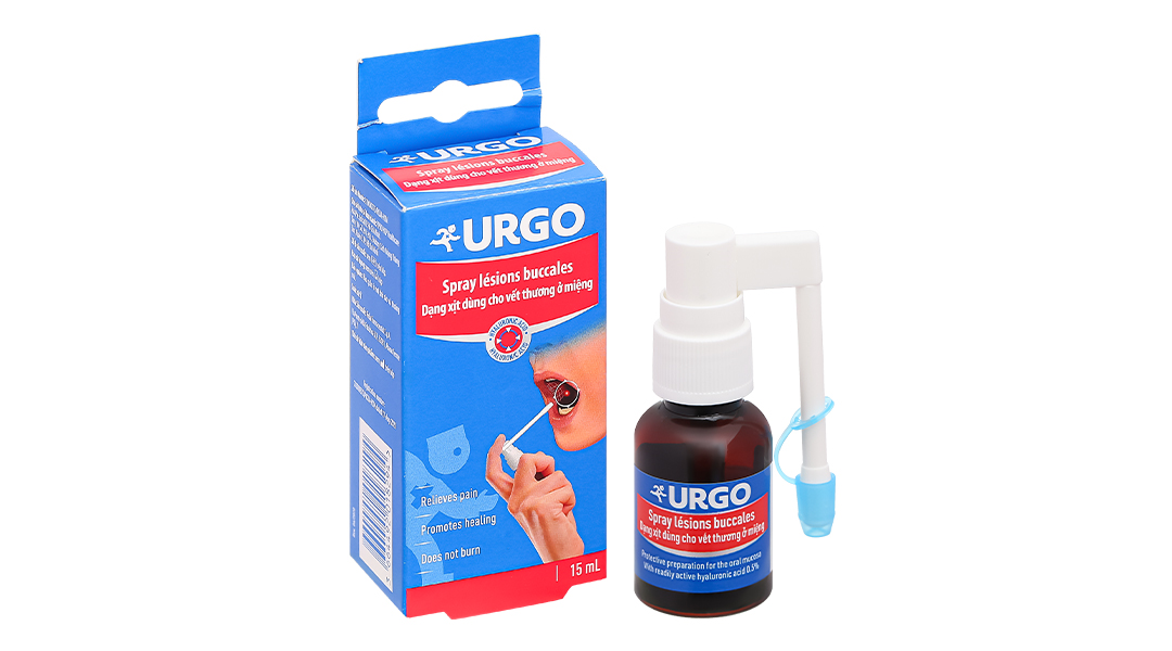 Dạng xịt dùng cho vết thương ở miệng – URGO Spray lésions buccales được chỉ định cho cả mục đích phòng ngừa, bảo đảm tính toàn vẹn của niêm mạc miệng và mục đích bảo vệ, gián tiếp thúc đẩy quá trình sinh lý của việc phục hồi các thương tổn niêm mạc do bất kỳ nguyên nhân gì: Các can thiệp trong nha khoa như thủ thuật lấy cao răng, tháo lắp răng giả; tổn thương niêm mạc miệng và tổn thương nướu do các nguyên nhân khác nhau (bỏng, nhiễm trùng, lây nhiễm, sử dụng thuốc), đặc biệt là các tổn thương niêm mạc vùng hầu họng.