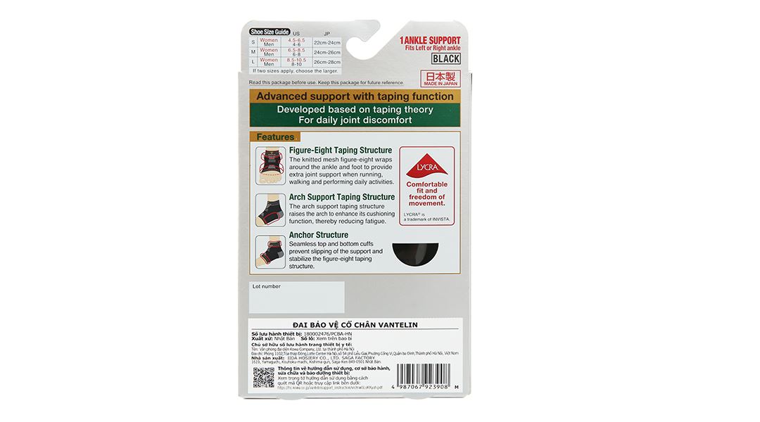 Đai bảo vệ cổ chân Vantelin Ankle Support là thiết bị, dụng cụ y tế được sản xuất tại Nhật Bản, phù hợp sử dụng cho mọi người, kể cả người cao tuổi và người có bệnh xương-khớp.