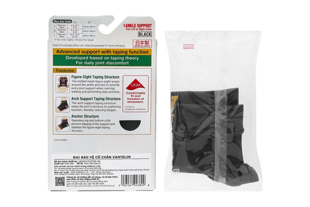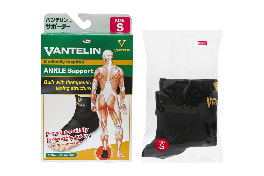 Cấu trúc đai dạng băng hình số tám bao quanh mắt cá chân và bàn chân để hỗ trợ thêm cho khớp khi chạy, đi bộ và thực hiện các hoạt động hàng ngày. Đai cũng có các vòng bít trên và dưới liền mạch ngăn ngừa bị trượt, giúp ổn định cấu trúc băng dán hình số tám. Ngoài ra, đai bảo vệ cổ chân Vantelin cũng hỗ trợ vòm bàn chân, giúp nâng vòm bàn chân để nâng cao chức năng đệm, từ đó làm giảm mệt mỏi cơ-xương khu vực cổ chân.