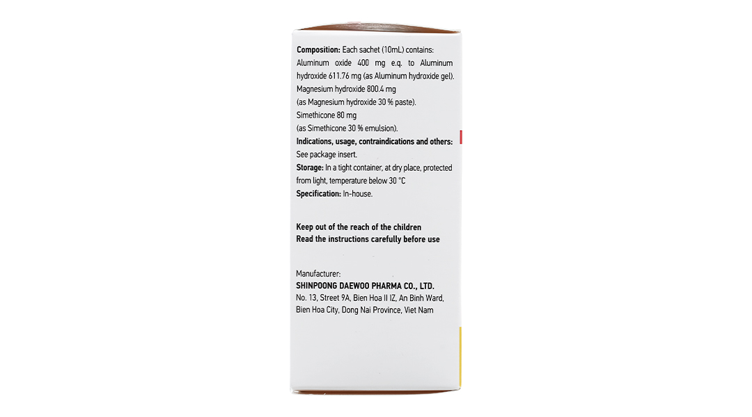 – Hoạt chất: Nhôm hydroxid gel tương đương 0.4g Nhôm oxid; Magnesi hydroxid 30% paste tương đương 0.8004g Magnesi hydroxid; Simethicon 30% emulsion tương đương 0.08g Simethicon