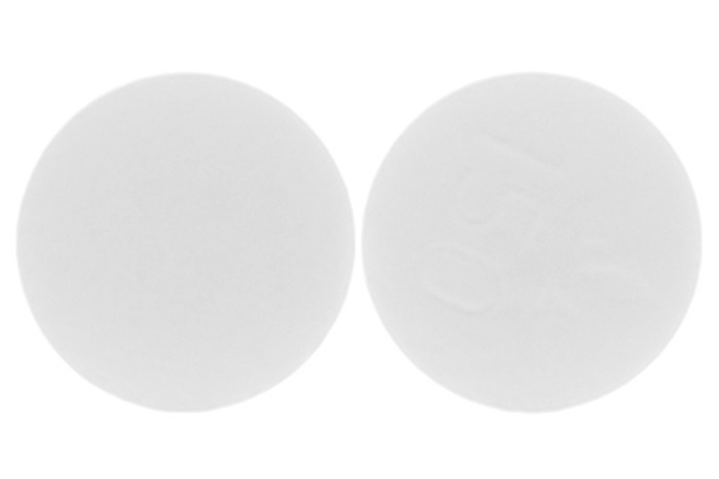 Vesicare 5mg: Viên nén bao phim hình tròn, màu vàng nhạt, có khắc logo và số “150” trên cùng một mặt.