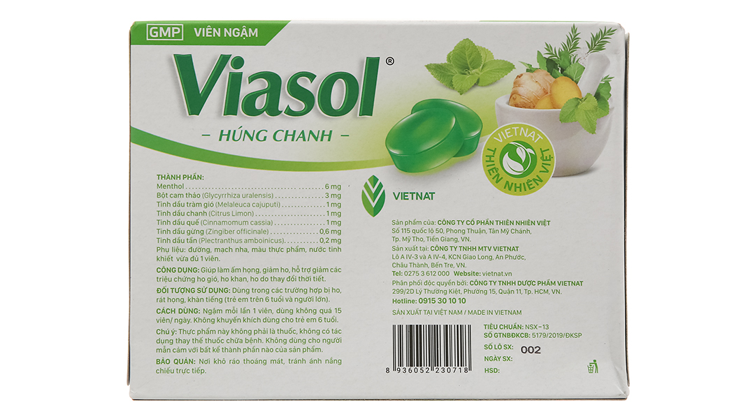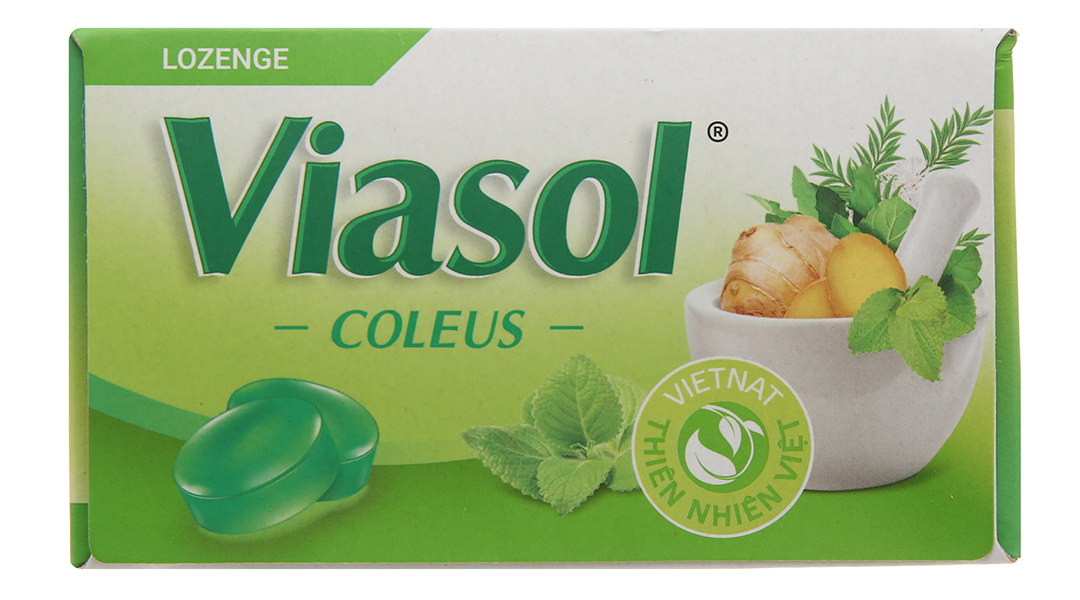 - Viên ngậm ho Viasol húng chanh được kết hợp từ các thành phần thiên nhiên như tinh dầu gừng, tinh dầu chanh. Có công dụng hỗ trợ làm ấm họng, hỗ trợ giảm ho, hỗ trợ các triệu chứng ho gió, ho khan, ho do thay đổi thời tiết.