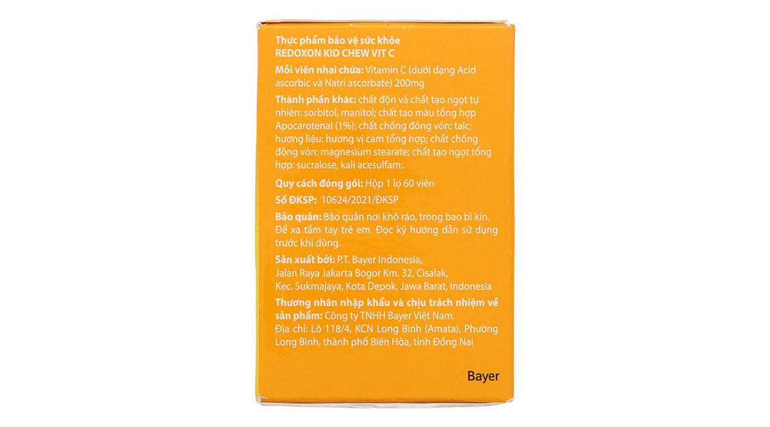 Chất tạo màu tổng hợp Apocarotenal (1%); Chất chống đông vón: Talc; Hương liệu: hương vị cam tổng hợp; Chất chống đông vón: Magnesium stearate; Chất tạo ngọt tổng hợp: Sucralose, Kali Acesulfam.